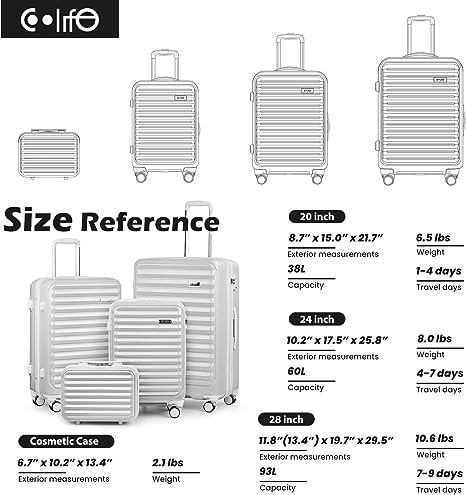 • The 4 piece set accommodates different packing needs: the 13 inch cosmetic case works well to store your toiletries, the 20 inch carry-on is perfect for overhead bins, the 24 inch luggage is ideal for those who want more space without being too bulky, and the 28 inch expandable option gives you even more space to pack.