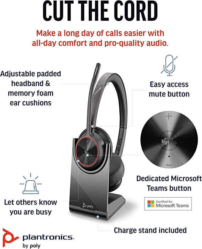 Plantronics Voyager 4320 UC Cordless Headphones + Charging Station (Poly) - Stereo Headphones, Noise-Cancelling Microphone, Long Battery Life, Bluetooth Connectivity PC/Mac/Phone, Team Certified