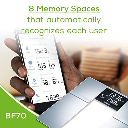 Beurer F70 Body Fat Scale, Weight, Water and More, Smart Digital Scale for Whole Body Analysis, BMI and Calorie Display, App Sync via Bluetooth, User Identification, 8 Memory Spaces, Grey