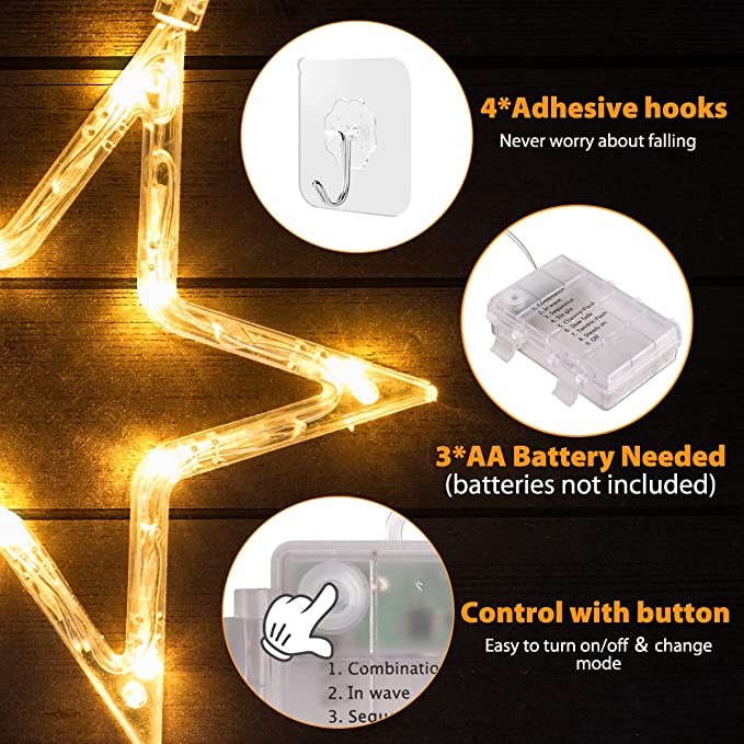 GlobaLink Christmas Star Window Lights, 3Pack 30LEDs Battery Powered Timer Window Star Hanging Lights, Waterproof Backdrop String Lights with 8 Modes for Indoor Outdoor Home Bedroom Party - Warm White