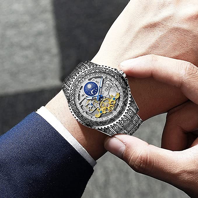 Mechanical Men's Watch Fashion Automatic Men's Clock Blue Stainless Steel Waterproof Business Skeleton Watch